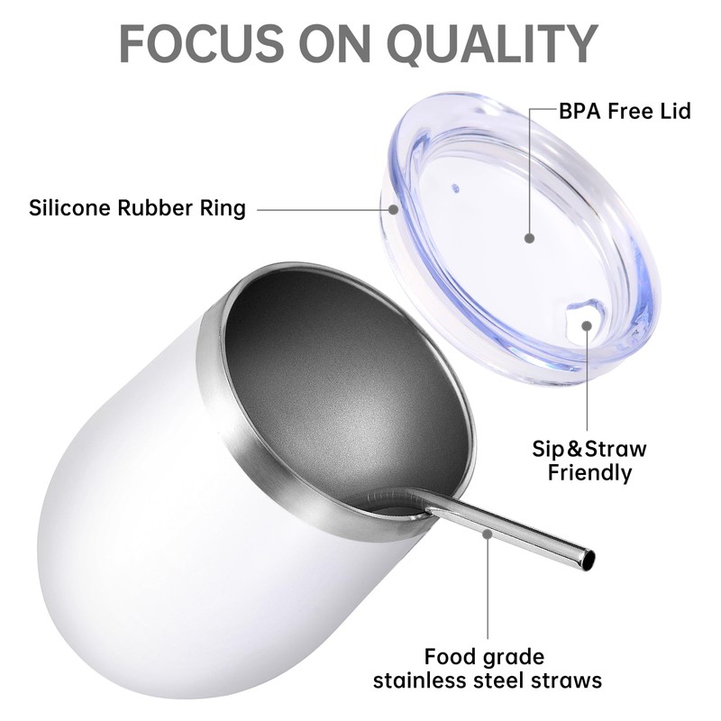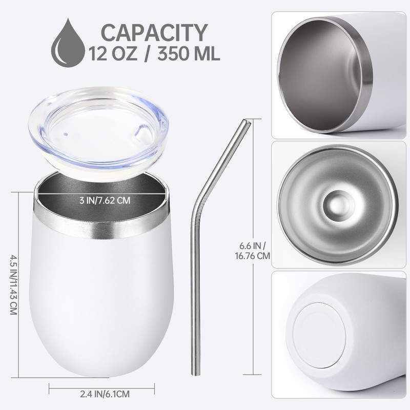 Volhoply 12oz Stainless Steel Wine Tumbler with Lid Bulk 4 Pack,Double Wall Vacuum Stemless Wine Glasses,Reusable Metal Travel Coffe Mug with Straw,Insulated Cup Gifts for Women,Christmas(White,4 Set)