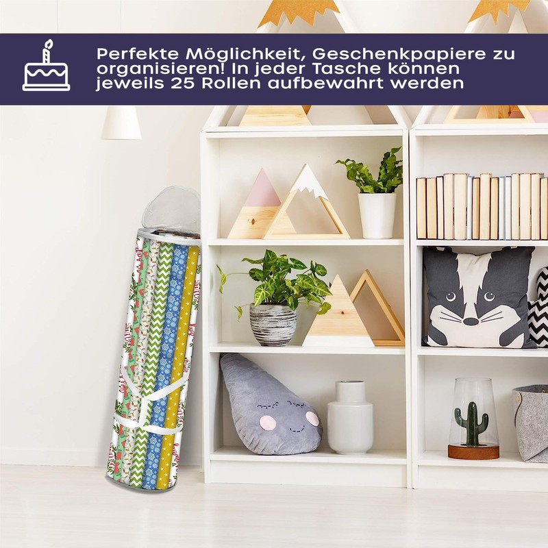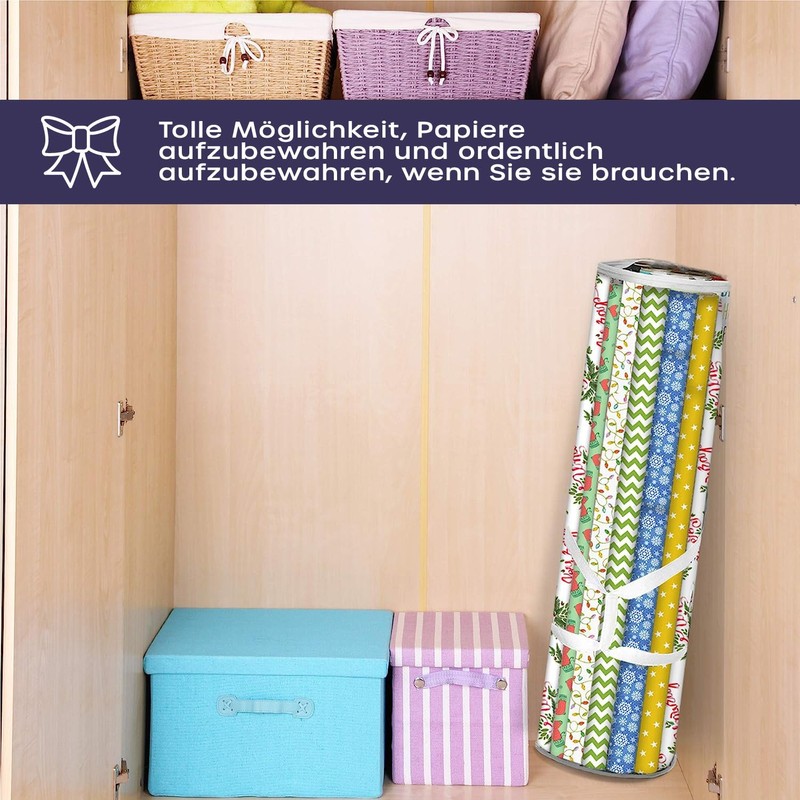 - Gift paper holder plus points: Our organiser wrapping paper bag is the ideal solution for tidy and space-saving storage of your wrapping paper rolls. The practical box for wrapping paper rolls not only saves money, but also ensures that the wrapping paper stays clean and tidy. The wrapping paper organiser storage has a secure zip on the top and Velcro handles that allow easy carrying.