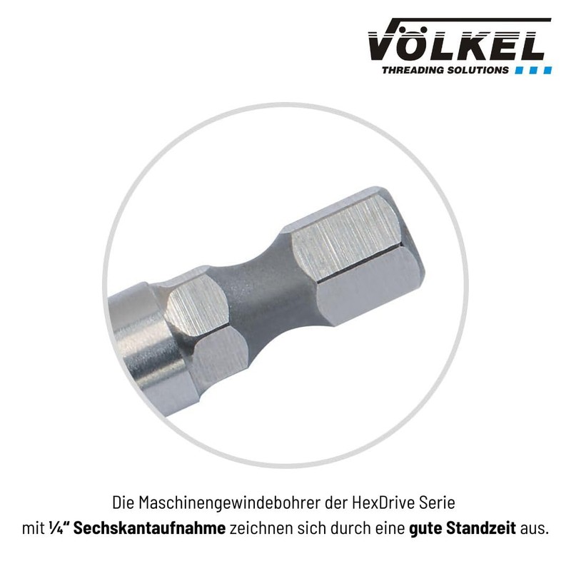 Völkel HexDrive Machine Tap (Hex Socket) 1/4 Inch Bit, HSS-E, M3-M12, DIN371/376, Form B & C, Metric Thread, Through Hole, Stainless Steel Drill, Tap Cutter