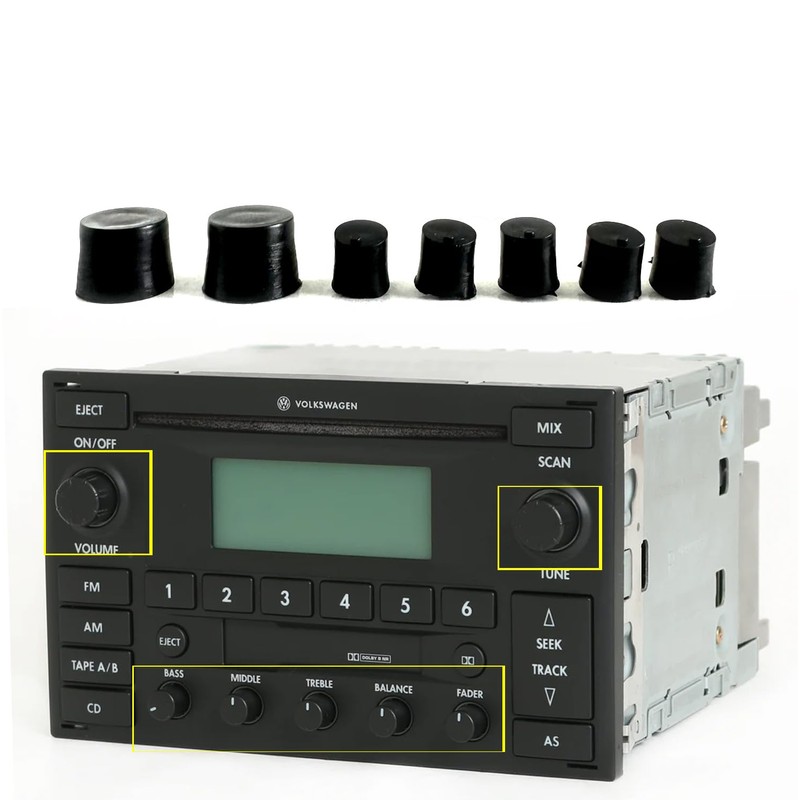 Aftermarket 7 KNOB Button set for Volkswagen - VW 2003 - 2004 - 2005 - 2006 - 2007 - 2008 - 2009 -- repacment for Golf, Golf GTI, Jetta, Jetta GLI, Passat RADIO ALL 7 KNOBS VW Monsoon CD Player fits the Jetta, Passat, Golf, GTI, 2001-2009 New and Improved with a lifetime warranty. Fits: VW Radios- 3B7035180, 3B7035180E, 3B7038180F, 3B7035180G, CFA00036B, CQ-JV1061XB, CQ-JV1067L, CQ-JV1060L, 1JM035157K,1JM035157P, 1JM035157J, 1JM035157D Interchangeable with Model # 3B7035180G The metal clip from old knob sometimes remains around the radio post. This clip is not needed for these new replacement knobs. Sometimes the old knobs will leave a small metal clip - sleeve around the radio knob post. I ask the customers to be sure to remove this clip before trying to slide the new knobs on. It is easily over looked and the new knobs will not slide over the old sleeve. Once this clip is removed the new knobs will have a secure tight fit, and will take some force to slide over the posts. The small knobs may take some adjustment to get the right alignment. Thank you!!!
