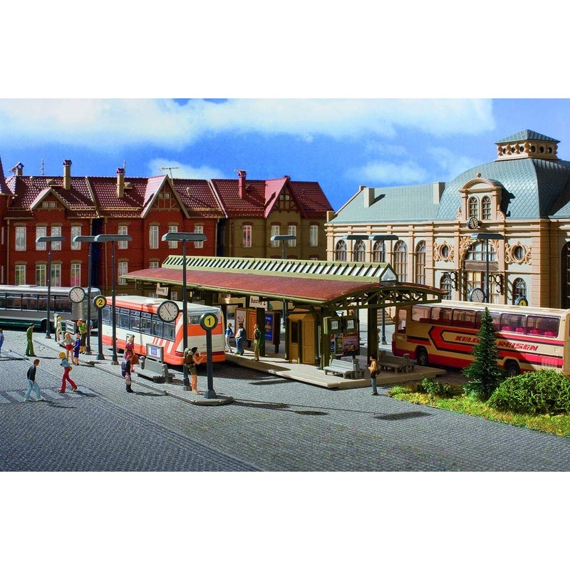 Bus station without bus kit. This bus station is very busy. The buses come from the suburbs and take passengers to the main station or from there to the city. This modern bus station features a kiosk, benches, timetables and much more. Please also note: Vollmer figures item no. 2319 waiting passengers. Scale: HO