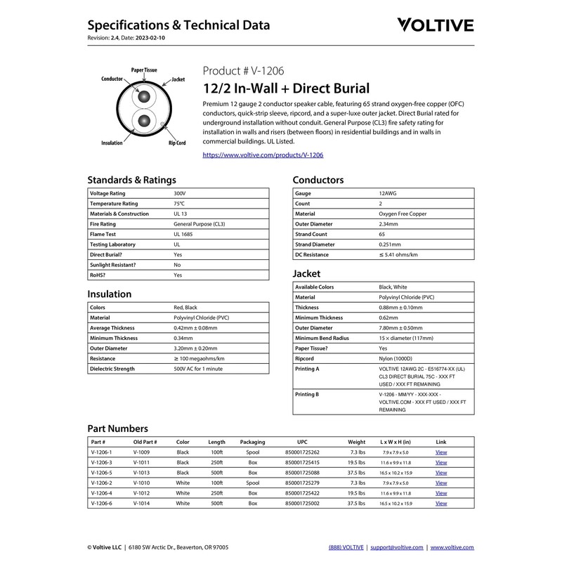 Voltive 12/2 Speaker Wire - 12 AWG/Gauge 2 Conductor - UL Listed in Wall (CL2/CL3) and Outdoor/In Ground (Direct Burial) Rated - Oxygen-Free Copper (OFC) - 100 Foot Spool - White