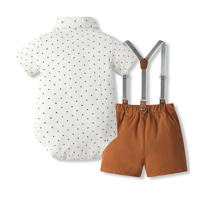 - Men's suit for baby boys: short sleeve shirt + removable bow tie + shorts + suspenders.