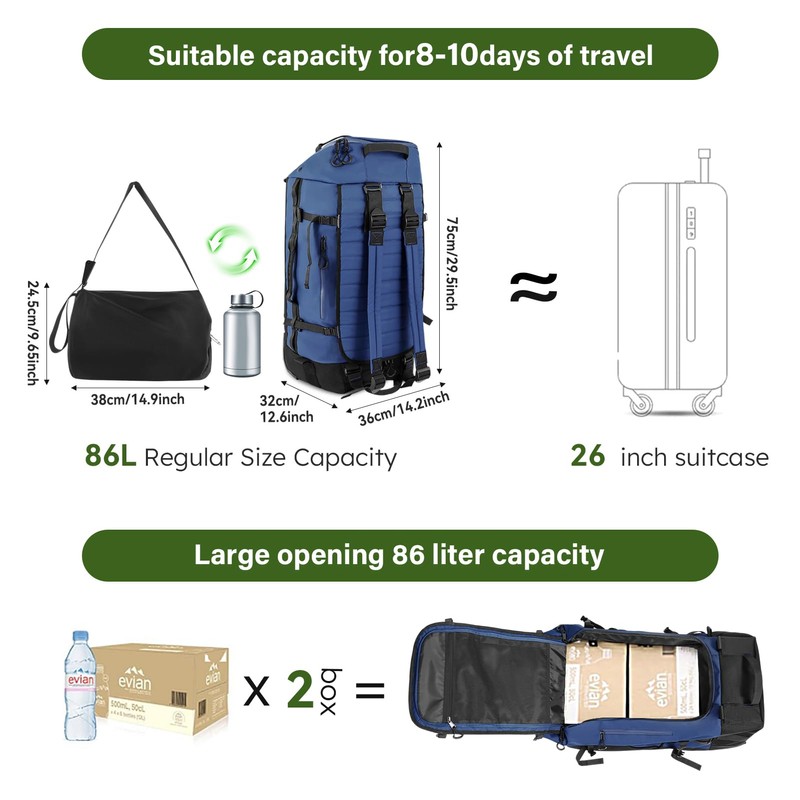 - Ample Storage: 86L main compartment,U-shaped mesh pocket,padded laptop sleeve,waterproof side pocket and shoe compartment