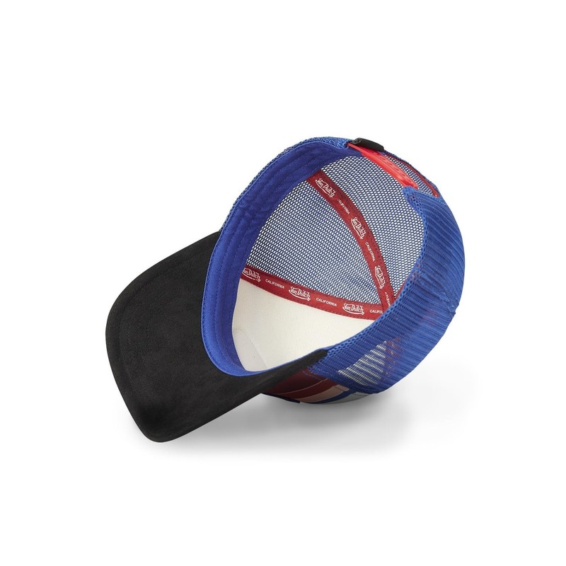 - Sell Blue and White Von Dutch Trucker Cap, Original Custom Design, Blue Band Reference, Baseball Cap for Men and Women with Red Von Dutch Badge in Relief, Trendy Curved Black Peak, Faux Suede, Adjustable Size.