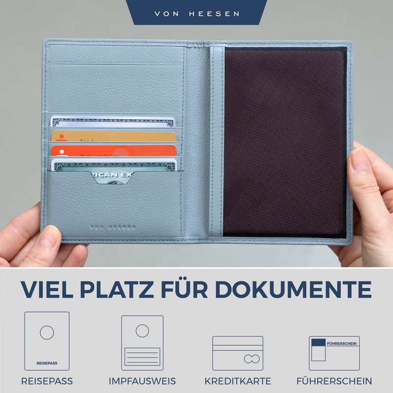 VON HEESEN Passport Holder Leather with RFID Protection for Men and Women, lightblue, Portrait