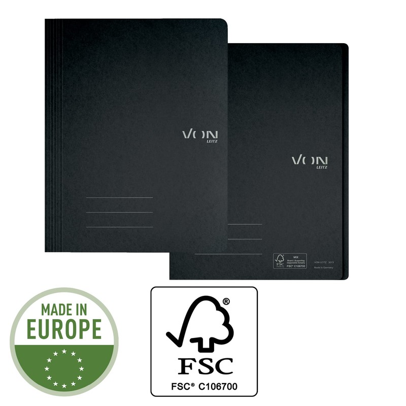 - Box contents: 5 x VON A4 file folders made of cardboard, 100% recycled, for 250 sheets with stapling mechanism, several colours (1x yellow, 1x blue, 1x red, 1x green, 1x black), 30131099