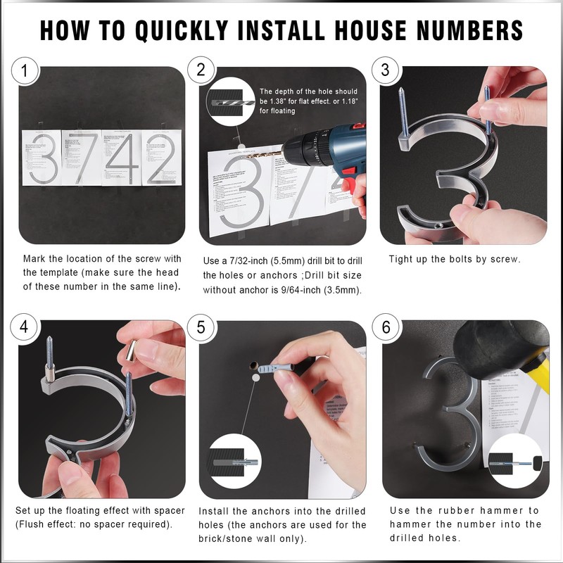 - Easy to Install: Each address number comes with 3 installation screws, 3 metal floating brackets, 3 anchor bolts, and a precise template guide; follow the steps in the operation manual to securely install them on any drillable surface, such as wooden boards, house walls, mailboxes