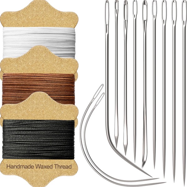 This set includes leather waxed threads in three colors and 11 heavy-duty needles, perfect for hand sewing, stitching, and repairing upholstery, car seats, shoes, clothes, leatherwork, and canvas. Each spool provides 22 yards of super-strong, waterproof polyester thread.