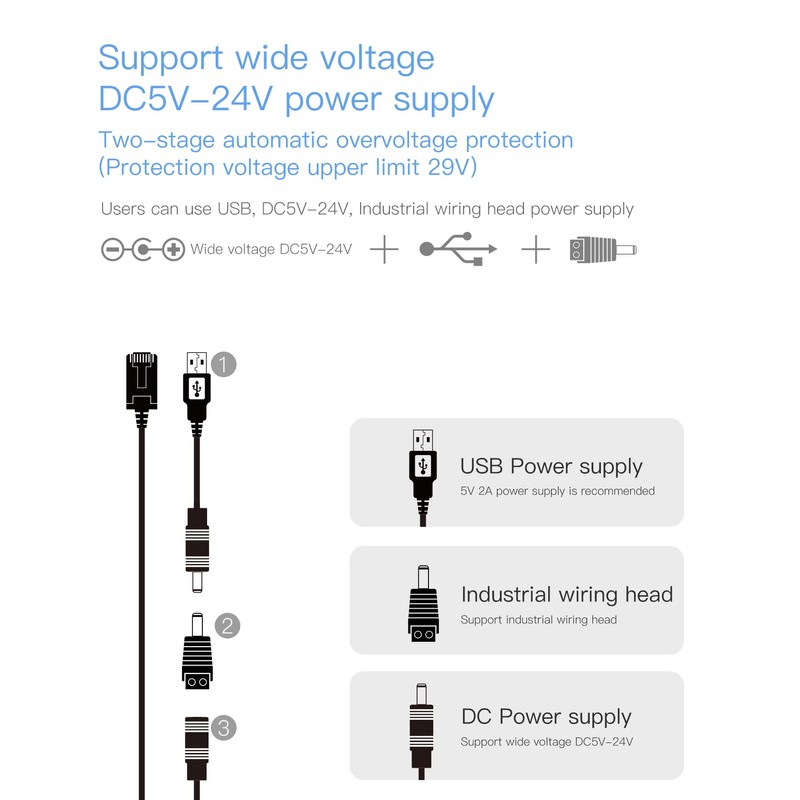 - 【Potencia y accesorios】Alimentado por amplio voltaje DC5V-24V (típico 5V/2A, ondulación inferior a 100mV), protección automática de sobretensión de dos etapas (límite superior de voltaje de protección 27V), modo alimentado USB o CC, 1 kit de fijación y 1 conector DC industrial, más adecuado para aplicaciones industriales.
