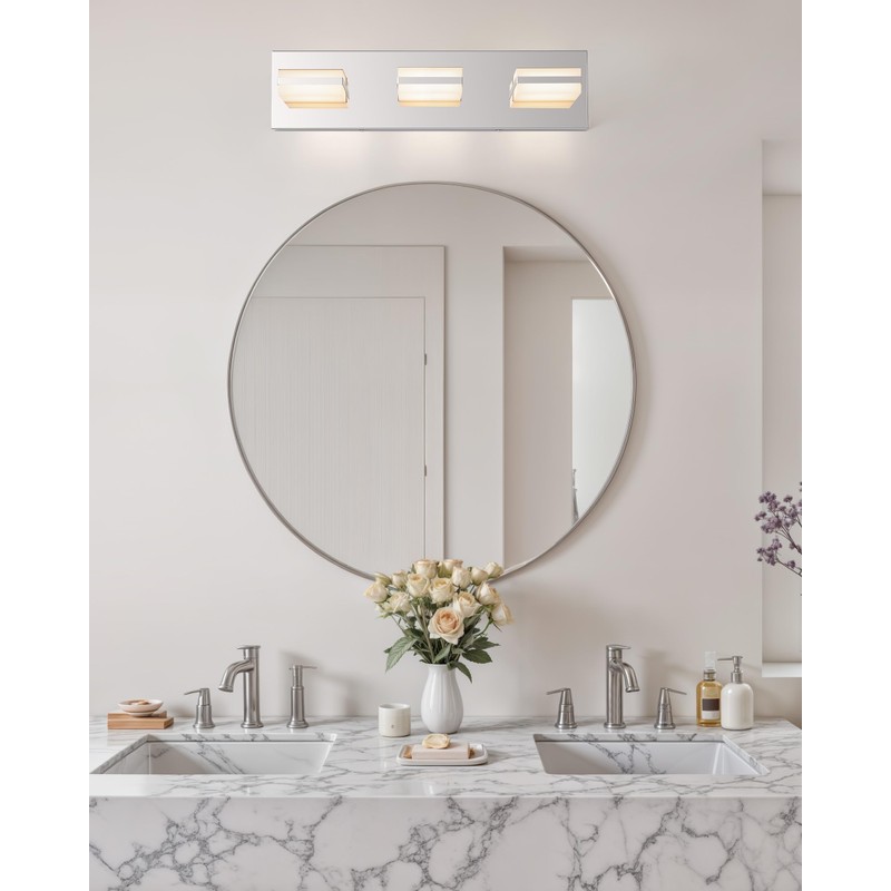 - Sleek Modern Style: This 3-light bathroom vanity light from Vonluce features a minimalist, clean-lined aesthetic with square shades and a chrome backplate, seamlessly blending into any contemporary decor