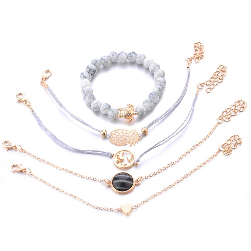 VONRU Beaded Bracelets for Women - Adjustable Charm Pendent Stack Bracelets For Women Friendship Gift Rose Quartz Bracelet Links with Pearl Gold Plated 5pcs/Set