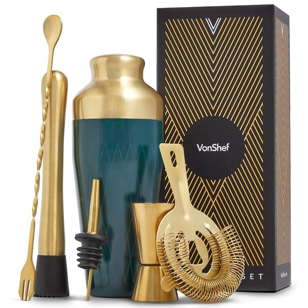 VonShef Cocktail Shaker Set, Gold & Green 6pc Set with Parisian Cocktail Shaker, Bartender Kit w/ Strainer, Muddler, Jigger & More, Gift Box Included