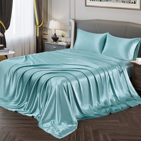 Vonty Satin Sheets Twin XL Silky Soft Satin Bed Sheets Aqua Sheet Set, 1 Deep Pocket Fitted Sheet + 1 Flat Sheet + 1 Pillowcases