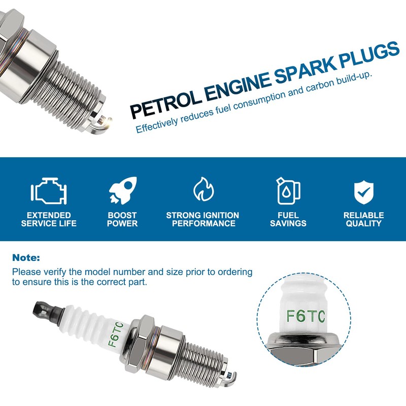 - Material The F6TC spark plug is made of ceramic and metal, strong and durable, can be used for a long time, high temperature resistant, has a long service life and good reliability.