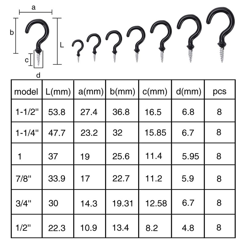 • EASY TO INSTALL The screw end design makes it very easy to install, sharp eye tips bite into wood easily and quickly, you can easily screw the metal cup hook into wood, cabinet, wall, ceiling.
