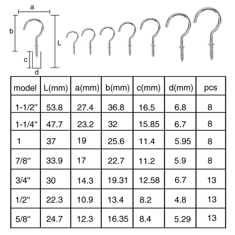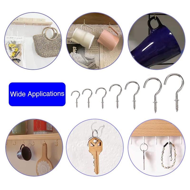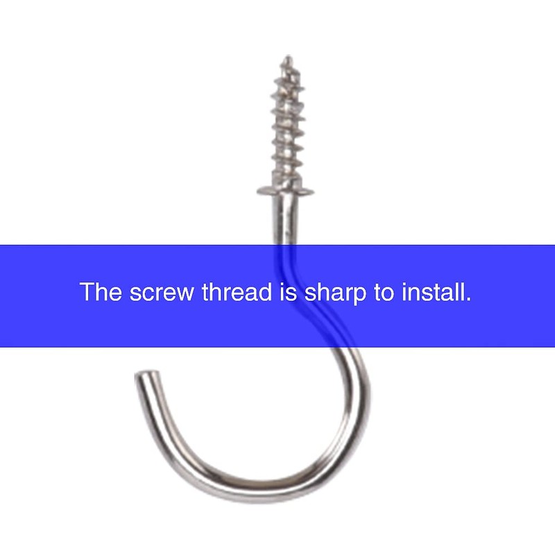 - EASY TO INSTALL The screw end design makes it very easy to install, sharp eye tips bite into wood easily and quickly, you can easily screw the metal cup hook into wood, cabinet, wall, ceiling.