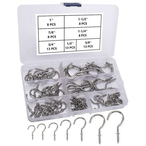 VooGenzek Pack of 71 Hook Screws, Screw-In Ceiling Hooks, Cup Hooks, Screw Hooks, Cup Hooks, 7 Sizes - Silver