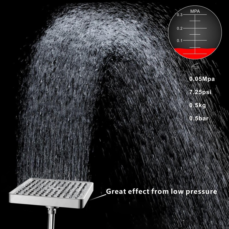 - 6" rain shower, The combination of pressure boosting and air-in technology leads to strong and high pressure, optimized for any water pressure, just like full and dynamic massage to your skin.Never worry about the low water pressure in your home. Our large rain shower heads always provide a consistent and powerful rainfall shower, giving you a hotel spa-like shower experience.1/2” connector fits with any universal shower arm. Solid metal Hose Nuts, filter and washer ensure reliable leak-proof connection.