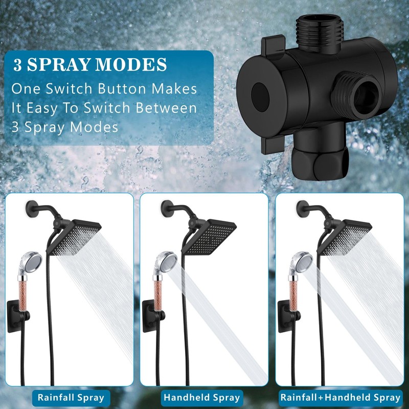 - PACKAGE INCLUDES - 6" square shower head, 3 spray handheld shower, 59" hose, 3-way diverter, self-adhesive bracket, flow restrictor, Teflon tape.