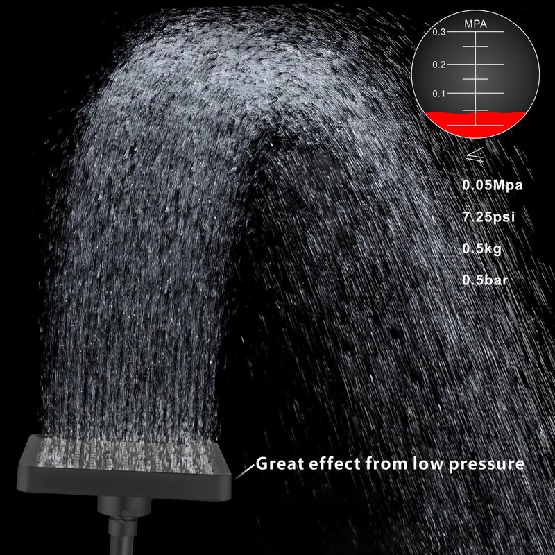 - 6" rain shower, The combination of pressure boosting and air-in technology leads to strong and high pressure, optimized for any water pressure, just like full and dynamic massage to your skin.Never worry about the low water pressure in your home. Our large rain shower heads always provide a consistent and powerful rainfall shower, giving you a hotel spa-like shower experience.1/2” connector fits with any universal shower arm. Solid metal Hose Nuts, filter and washer ensure reliable leak-proof connection.