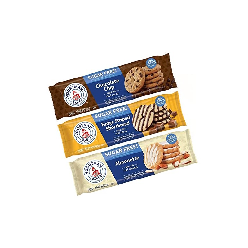 - Includes: 8 oz. Sugar Free Chocolate chip, 8 oz. Sugar Free Iced Almonette, 11.3 oz. Sugar Free Fudge Striped Shortbread