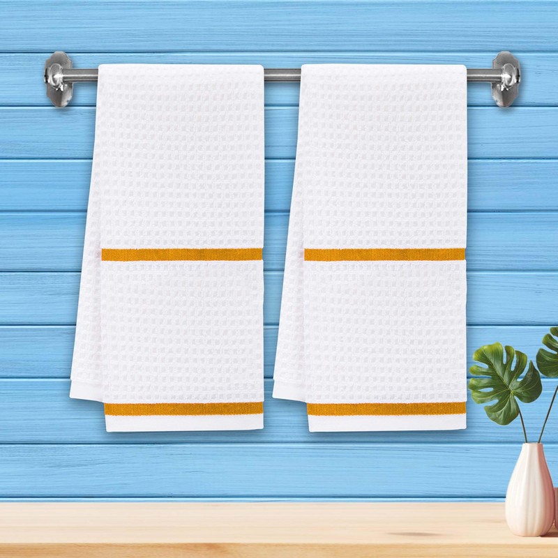 VOOVA & MOVAS White Dish Towels, Waffle Weave Kitchen Hand Towels 6PC - 100% Cotton | Soft | Absorb | Daily Use, Dish Towels for Kitchen,White Check with Yellow Stripe