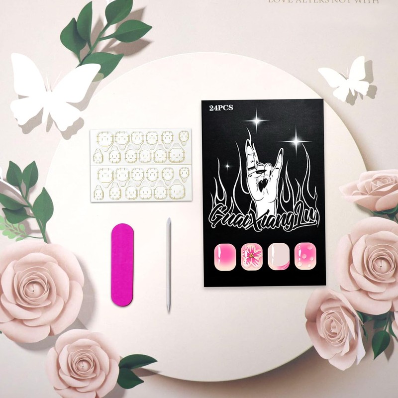 - Package Nails:You'll get 24 false nails in 12 sizes. 1 mini nail file, 1 small wooden stick, 1 piece of adhesive tab glue. You can safely choose a fake nail that fits your finger size and DIY your desired nail shape