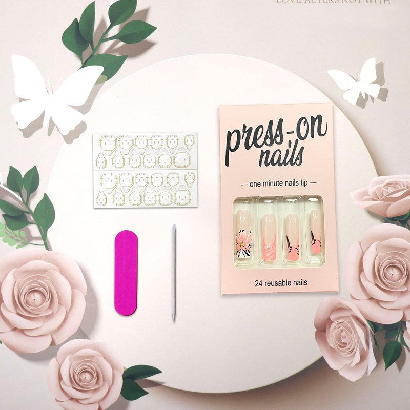 - Package Nails:You'll get 24 false nails in 12 sizes. 1 mini nail file, 1 small wooden stick, 1 piece of adhesive tab glue. You can safely choose a fake nail that fits your finger size and DIY your desired nail shape