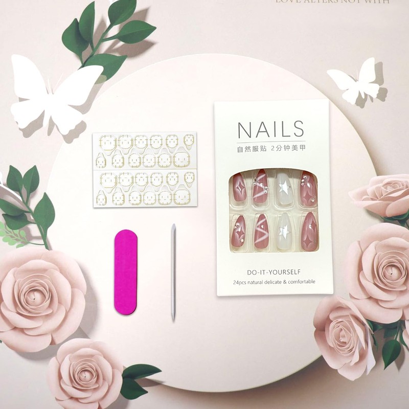 - Package Nails:You'll get 24 false nails in 12 sizes. 1 mini nail file, 1 small wooden stick, 1 piece of adhesive tab glue. You can safely choose a fake nail that fits your finger size and DIY your desired nail shape