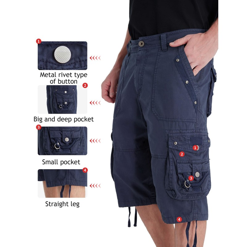 • Deep multiple pockets: Long shorts have 8 pockets lots of room for phone, wallet,earbuds,keys. The snap closing pockets can secure them even more. 2 Slash Pockets, 2 Rear Cargo Pockets, 2 Side Cargo Flap Pockets and also has 2 little outer pockets.