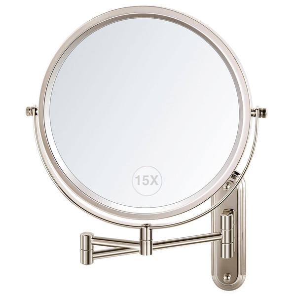 - 【Double Sided 1X/15X Magnifying Mirror】This wall mounted makeup mirror is double sided with 1X and 15X magnification. The high definition 1X makeup mirror for your overall facial makeup, while the 15X magnification mirror ensures every detail of your face is flawless. Please keep 4 inch distance when use the 15x magnifying mirror to avoid dizzy.