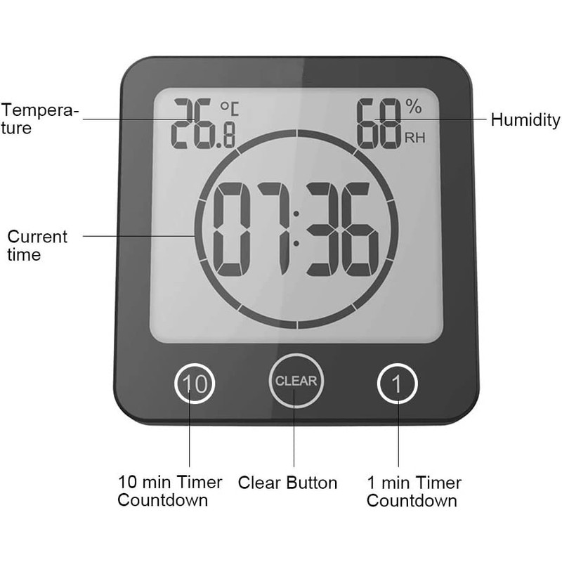 VORRINC Bathroom Clock, Bathroom Clock with Suction Cup, Bathroom Clock Waterproof Touch Control ℃/℉ Humidity Temperature LCD Display, Countdown Timer, 3 Mounting Methods (Black)