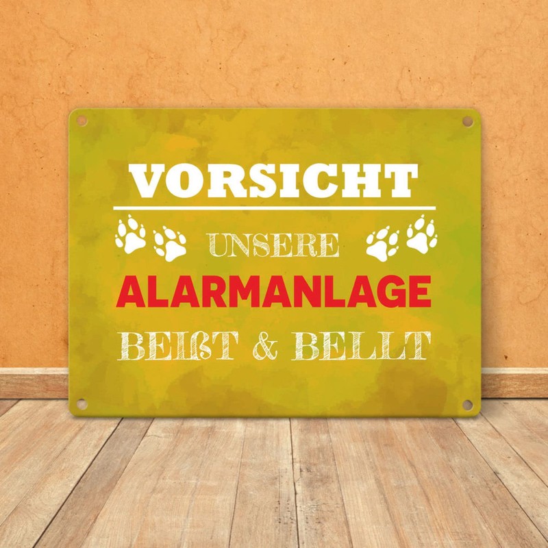 - Box contents: 1x Vorsicht unsere Alarmanlage beißt & bellt metal sign in 15 x 20 cm in yellow