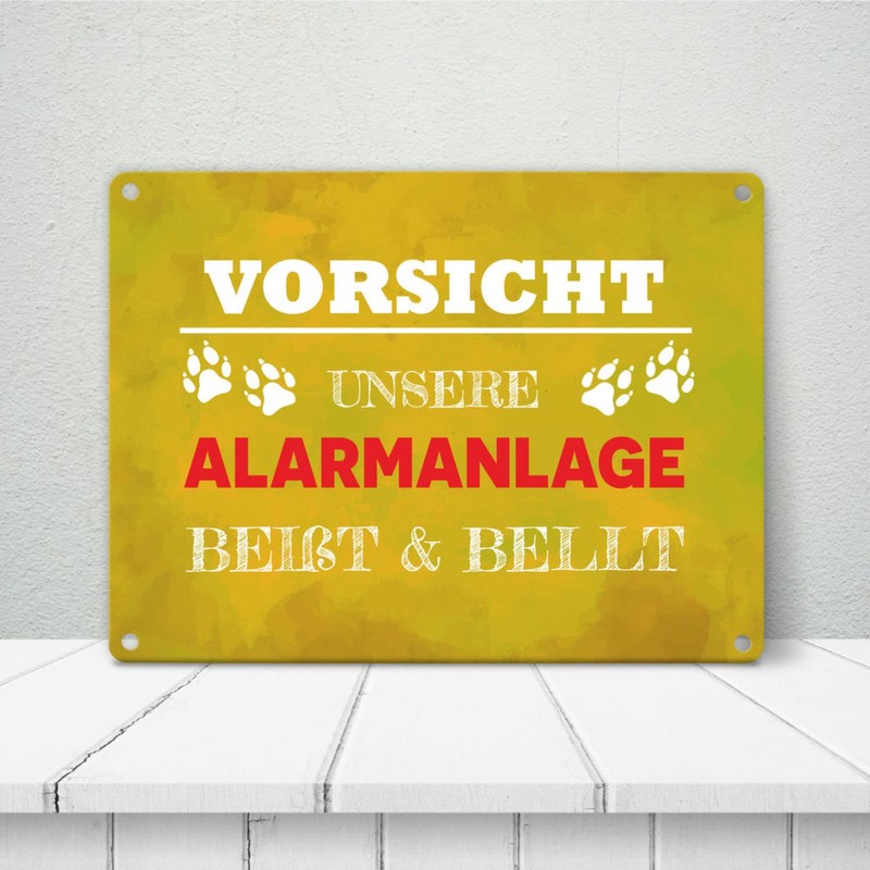 - The metal sign shows the text 'Vorsicht, unsere Alarmanlage beißt & bellt' with dog paws as decoration. The background is in yellow, optionally also in three other colours.