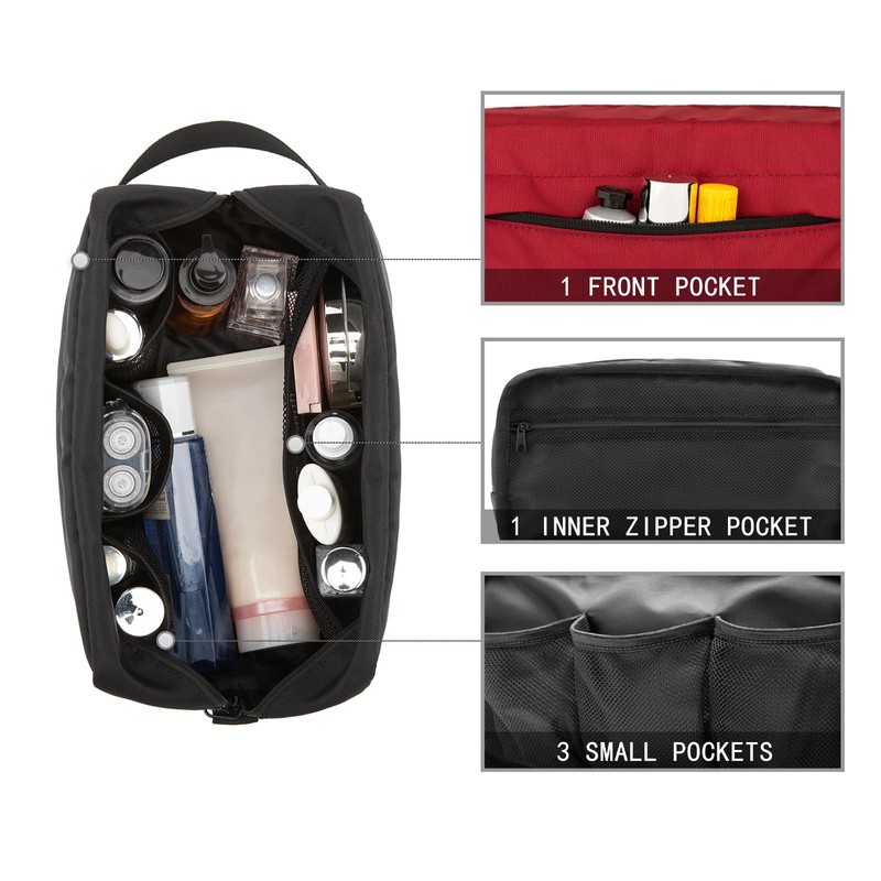 - Large size & organized compartments: Size 10 x 5 x 5.5 inches. 1 Main compartment which is roomy to fit facial cleanser, electric shaver, travel shampoo, and other toiletries. It has 3 small mesh pockets and 1 long mesh zipper pocket inside to store all of your little toiletries without getting disorganized. 1 front zipper pocket that provides extra storage with ease