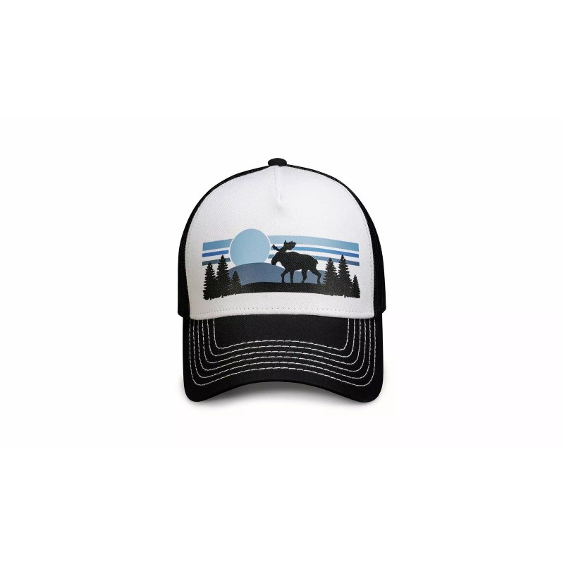 Classic white and black mesh cap with Moose graphics in black and blue.