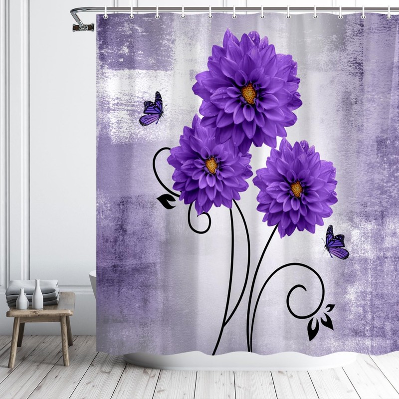 Voshin Floral Shower Curtain Purple Dahlia Flowers and Butterfly Fabric Shower Curtains for Bathroom, Rustic Farmhouse Country Shower Curtain Set with Hooks, 69 X 70 Inch