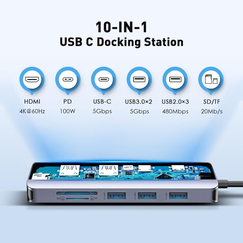 - Versatile 10-in-1 Design: Equipped with a 4K HDMI adapter, SD/TF card reader, USB-C 3.0 data port, 100W PD charging port, 2 USB 3.0 ports (up to 5Gbps), and 3 USB 2.0 ports. This adapter is an ideal gadget for most laptops, tablets, switch with usb c/thunderbolt 3/type c port. Such as: Macbook pro Macbook Air 2024 2023 2022 M1 M2 M3 iMac iPad Pro iPhone 15 16 Pro/Pro Max Dell Lenovo HP laptops with usb c port.
