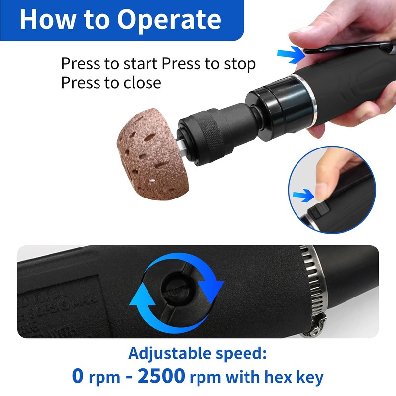 - Easy Operation: Equipped with a platen-style on/off switch and 0–2500 RPM adjustable speed, this pneumatic tire repair kit offers effortless control using a hex key — perfect for both beginners and professionals.