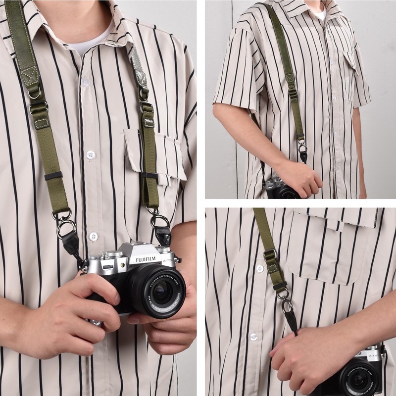 - VERSATILE SHOULDER STRAP The PU shoulder strap is adjustable, it can also be hung over the body or around the neck, making it suitable for most people. It is connected to the camera through a camera eyelet hole, so you can use the included shoulder strap separately to mount it on the camera with the corresponding hole.
