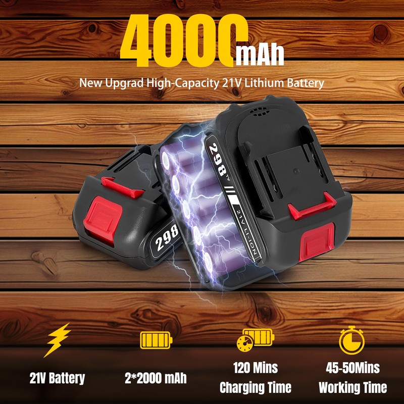 - 【Dual-Battery Long Runtime】Your chainsaw comes with two 21V 2000mAh batteries, supporting over 2 hours of continuous operation. The quick-swap design allows alternating charging to keep your wood cutting or garden trimming uninterrupted.