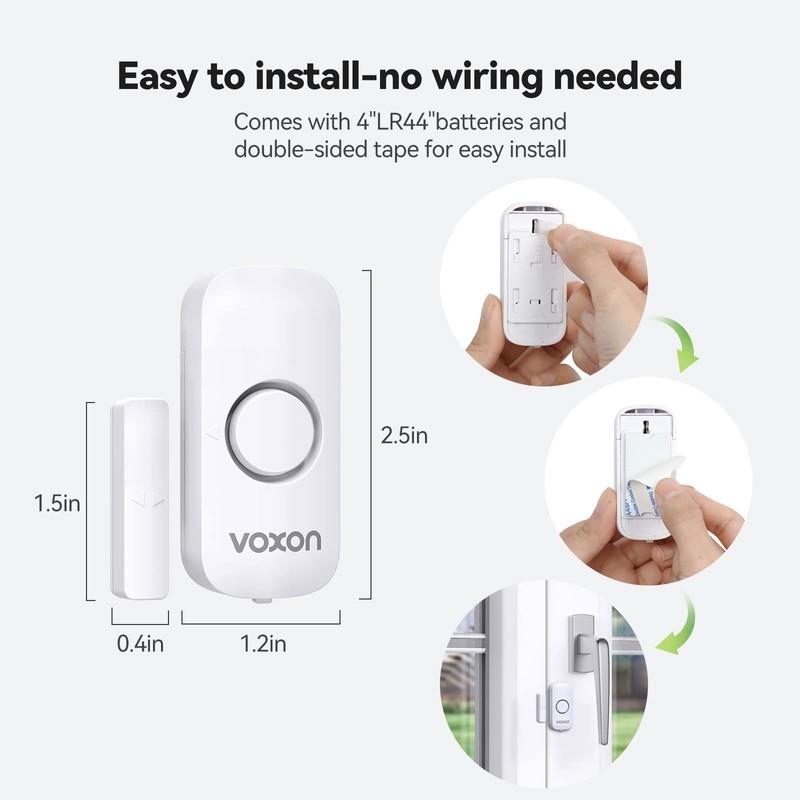 - 【Smart Design】 Once the alarm and magnet are separated more than 0.78 inches (20mm), the alarm siren keeps going until you close the door. Window alarm sensors are powered by four long-lasting LR44 batteries (included), which can be used for up to 3 years.
