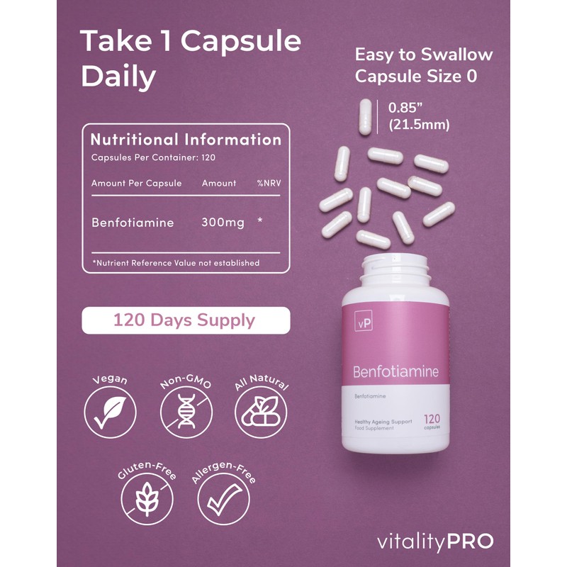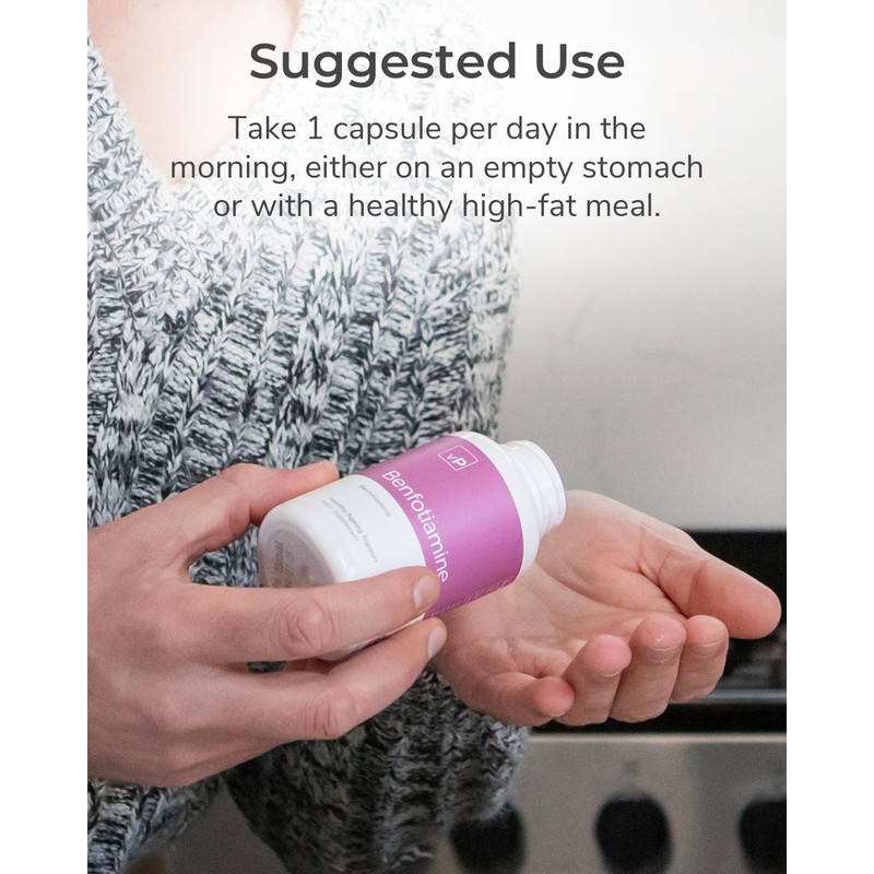 - Suggested Intake: We recommend taking 1 benfotiamine 300mg capsule every day in the morning, with an empty stomach or a healthy high-fat meal. Each bottle contains 120 x 300mg capsules, giving you 120 day supply. Our Benfotiamine supplements for women and men are for adult use only.