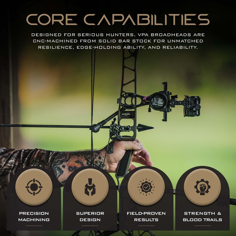 VPA 3-Blade Broadheads are rock solid and machined with precision to give you perfect flight every time. No weld lines or brazing combined with the pyramid style chiseled points give the broadhead “bone-splitting” strength. Compatible with all bow and arrow combinations. Easy to maintain as it is engineered to lay flat on a sharpening stone for a quick clean up and re-use.  Put VPA 3-Blade Broadheads in your quiver and experience the difference!