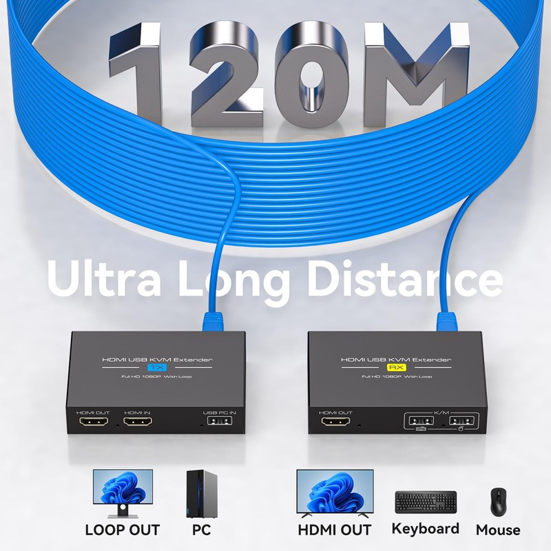 - 400FT/120M HDMI Extender With this HDMI KVM USB Extender, you can use a single oxygen-frees copper UTP Ethernet-cable (Cat6/7) to replace the HDMI cable to achieve long distance transmission (400FT/120M), which is a good helper for classrooms, conference rooms and home theaters. (Note: UTP cable needs to follow IEEE-568B standard)