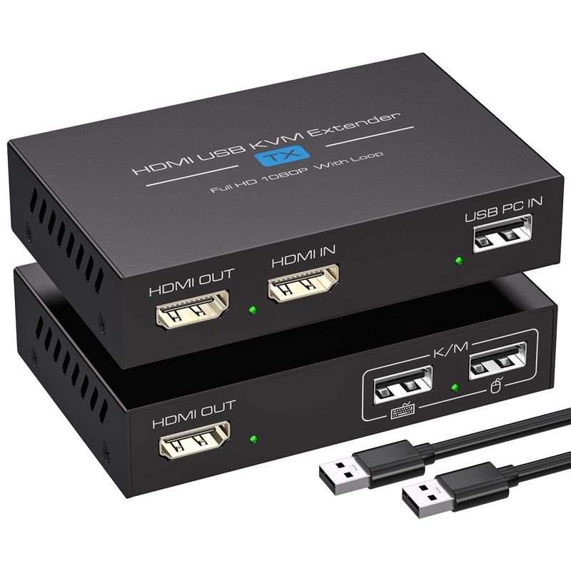 - Loop-out+Reset FunctionThis KVM HDMI Extender has a loop-out function, can be directly connected to the monitor (need to support 1080P), which is more convenient to monitor the status of the remote monitor.Easy reset with a single press of the RST button.Indicator lights allow you to easily recognize the connection status (output signal indicator: illuminates when communication with the receiver is normal)