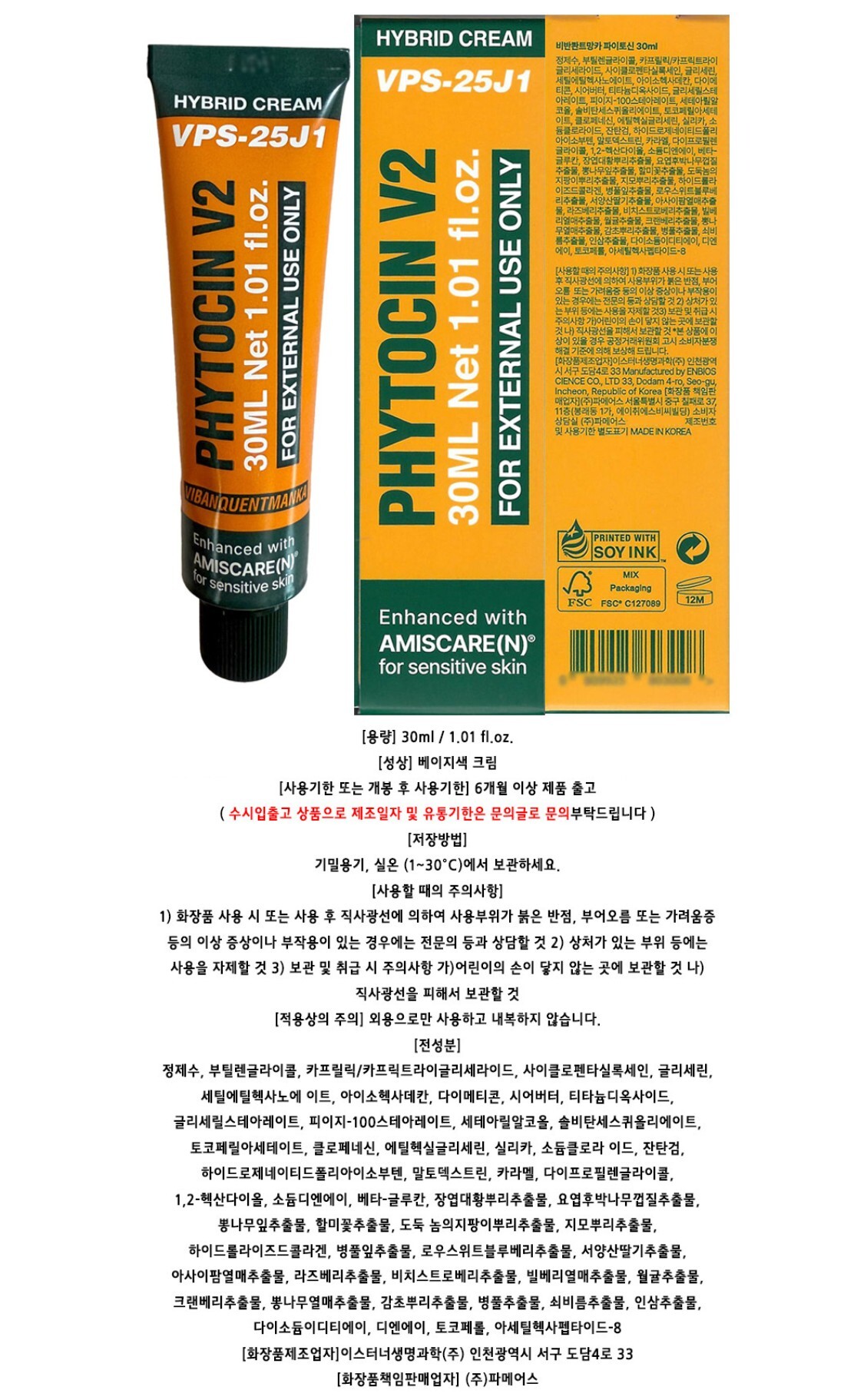 VQM Phytocin Cream 30ml x 1 / VQM 파이토신 크림 30ml 1개 브이큐엠