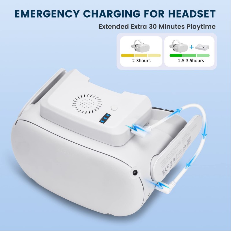 - 【3 SPEEDS & HIGH-POWER BATTERY】VR cooling fan for Oculus with 3 speed for different types of game modes. And the fan has 2 built in 800mah batteries that can last from 3‑8 hours, and takes only one hour to fully . Also act as a small emergency , providing emergency charging when the battery runs out and extending the VR life by 30 minutes.