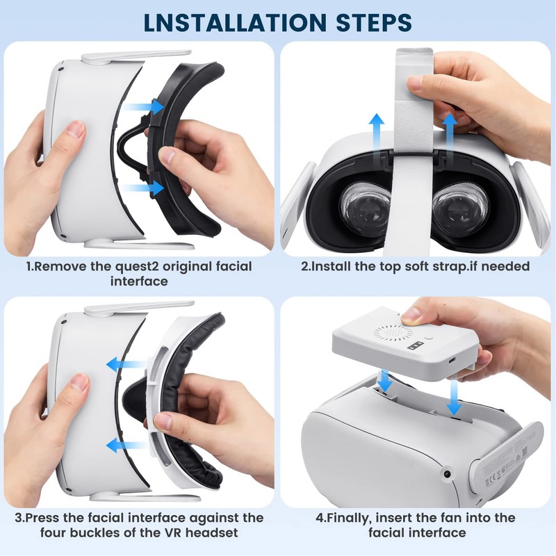 - 【EASY INSTALL】 To install the facial cover, just ensure the upper and lower 4 buckles are firmly attached to the headset and it snaps the headset very securely, tightly, and does not budge. And The cooling fan for Quest 2 is lightweight, no obvious weight gain after wearing, and does not squeeze the forehead.